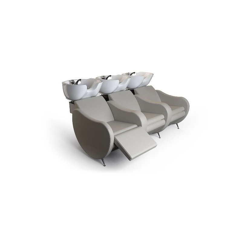 Мойка парикмахерская - трехместная. Мойка оснащена металлическим каркасом черного цвета, мягкими и комфортными подлокотниками, ножками из полированного алюминия и электрической подножкой, что позволяет клиенту принять положение "полулежа" обеспечивая максимальный комфорт. Мойка комплектуется глубокими керамическими раковинами с регулировкой угла наклона и комплектом смесителя. Обивка - искусственная кожа высшего качества.