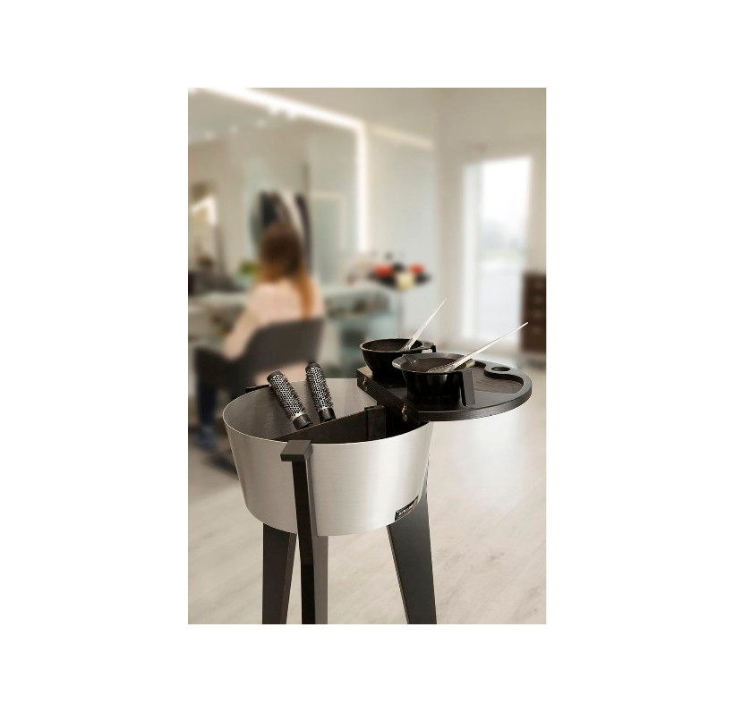 Тележка для окрашивания ICON сочетает в себе натуральные материалы - дерево и металл. Тележка оснащена колесами для удобства перемещения. Верхняя часть оснащена отсеком для хранения инструментов и откидной столешницей, предназначенной для размещения мисок для окрашивания. Тележка ICON сочетает в себе дизайн и функциональность.