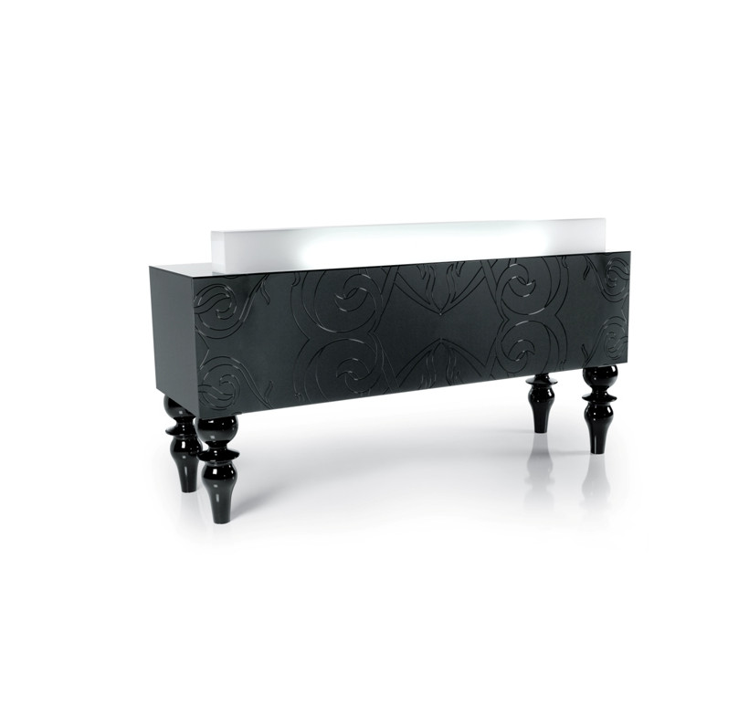 Стойка администратора. Корпус и наполнение выполнены в акриле черного или белого цвета. Фасад выполнен в глянцевом акриле черного или белого цвета с рисунком.