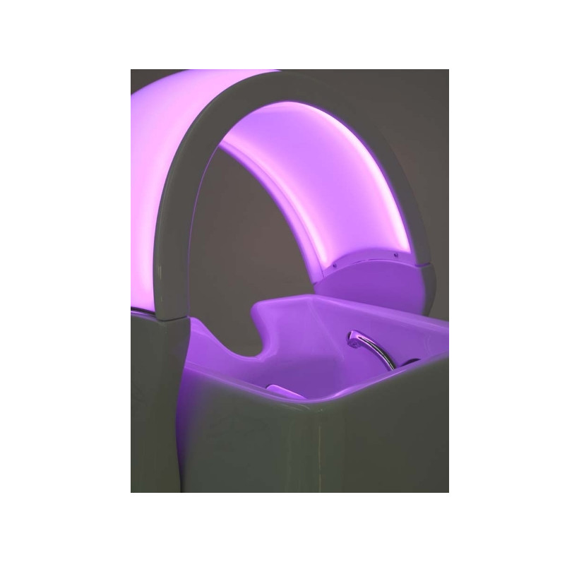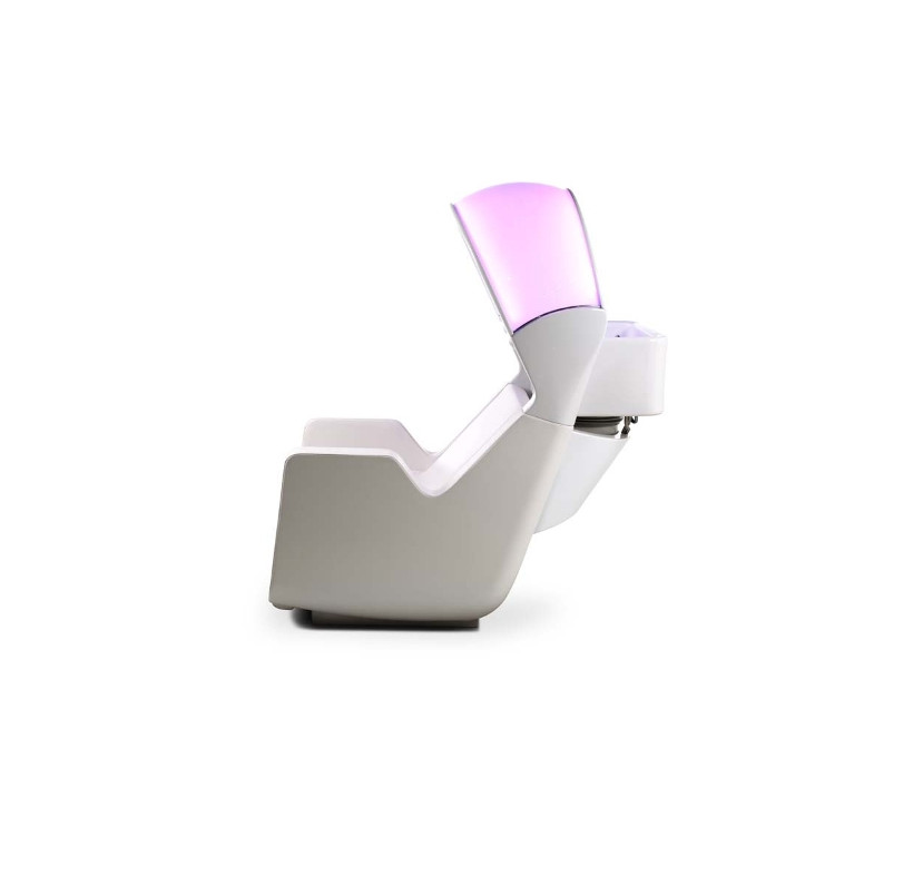 Парикмахерская мойка. Мойка оснащена мягкими и комфортными подлокотниками, системой хромотерапии RGB с лампами LED, которая способствует снятию стресса и нервного напряжения. Эргономика посадочного места позволяет клиенту принять положение "полулежа" обеспечивая максимальный комфорт. Мойка комплектуется глубокой квадратной керамической раковиной с регулировкой угла наклона и комплектом смесителя. Обивка - искусственная кожа высшего качества.