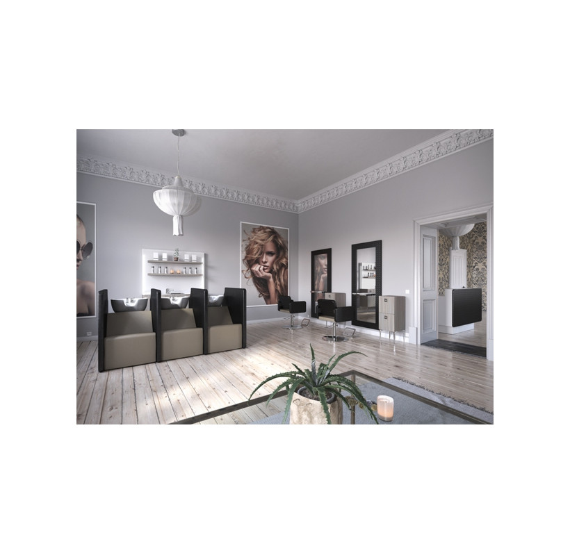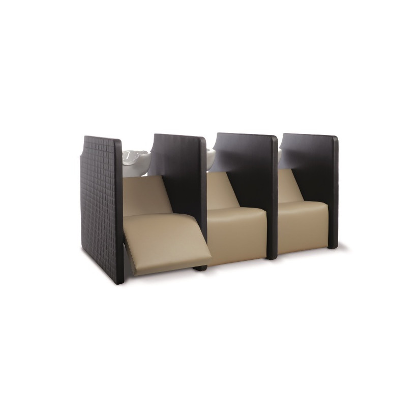 Мойка парикмахерская - трехместная с высоким уровнем комфорта и приватной зоной. Мойка оснащена системой воздушного массажа AIR-SHIATSU. Также мойка оснащена электрической подножкой, обеспечивая клиенту максимальный комфорт. Мойка комплектуется глубокими керамическими раковинами с регулировкой угла наклона и комплектом смесителя. Обивка - искусственная кожа высшего качества.