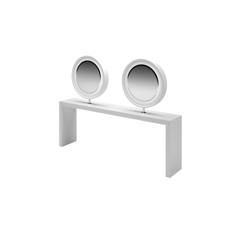 Двусторонний рабочий туалет на четыре рабочих места. Рабочий туалет выполнен в ламинате белого цвета. Рабочий туалет оснащен зеркалами округлой формы в декоративной раме.