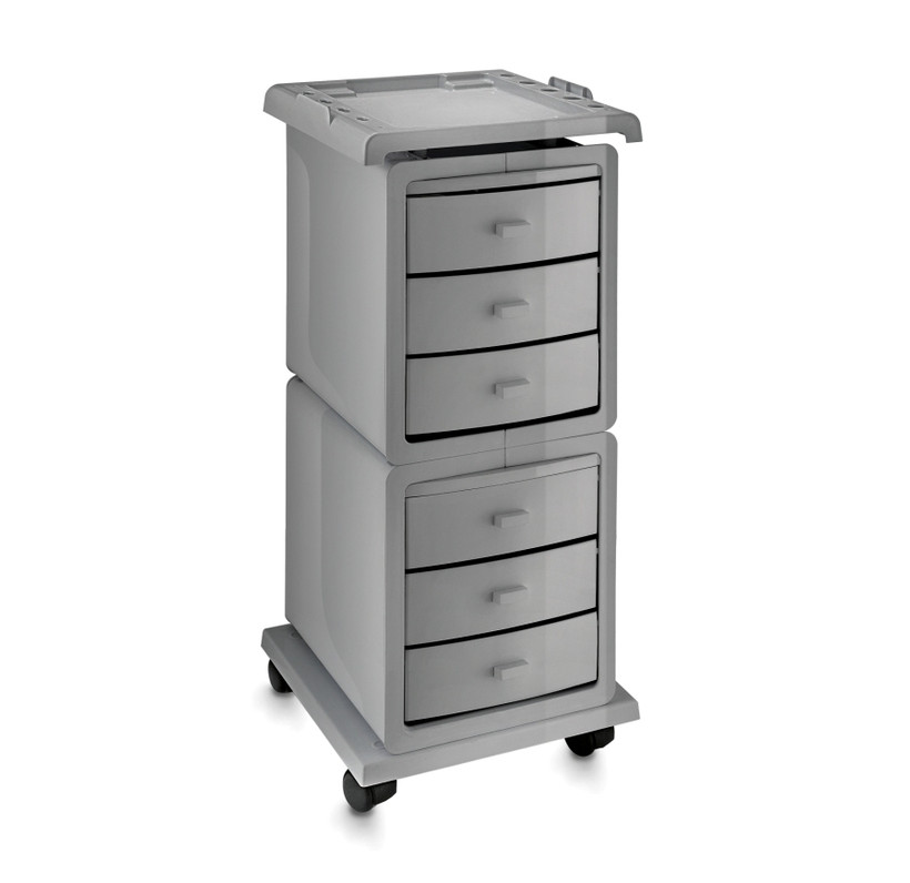 Тележка парикмахерская из прочного пластика закрытого типа на колесах. Имеет боковые отверстия под кисти и сопутствующие аксессуары, а также металлический фенодержатель.