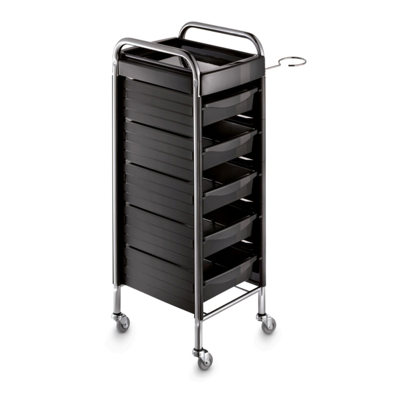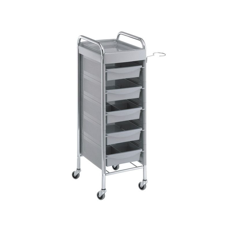 Тележка парикмахерская на хромированном каркасе из прочного пластика с пятью выдвижными ящиками. Оснащена прорезиненными колесами для комфортного и бесшумного перемещения и металлическим фенодержателем.