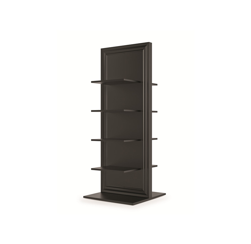 Напольная двухсторонняя витрина с четырьмя полками с каждой стороны.