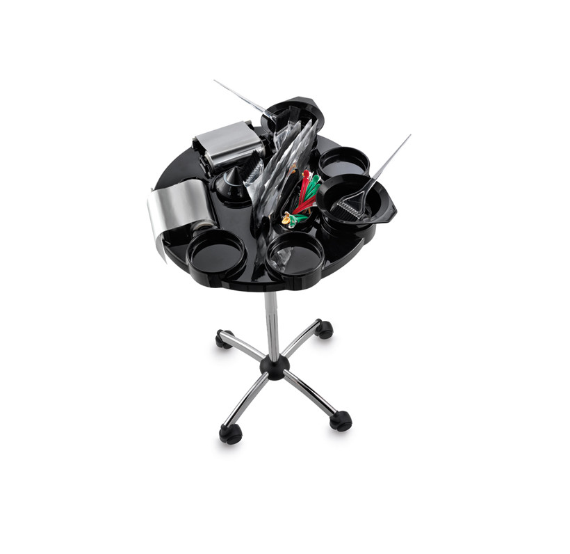Тележка из пластика на колесах. Имеет 5 отделений под миски для окрашивания, 5 отделений под кисти, 2 держателя с резаком для фольги, отделение для таймера TIMER DRINN и контейнер для сопутствующих аксессуаров.