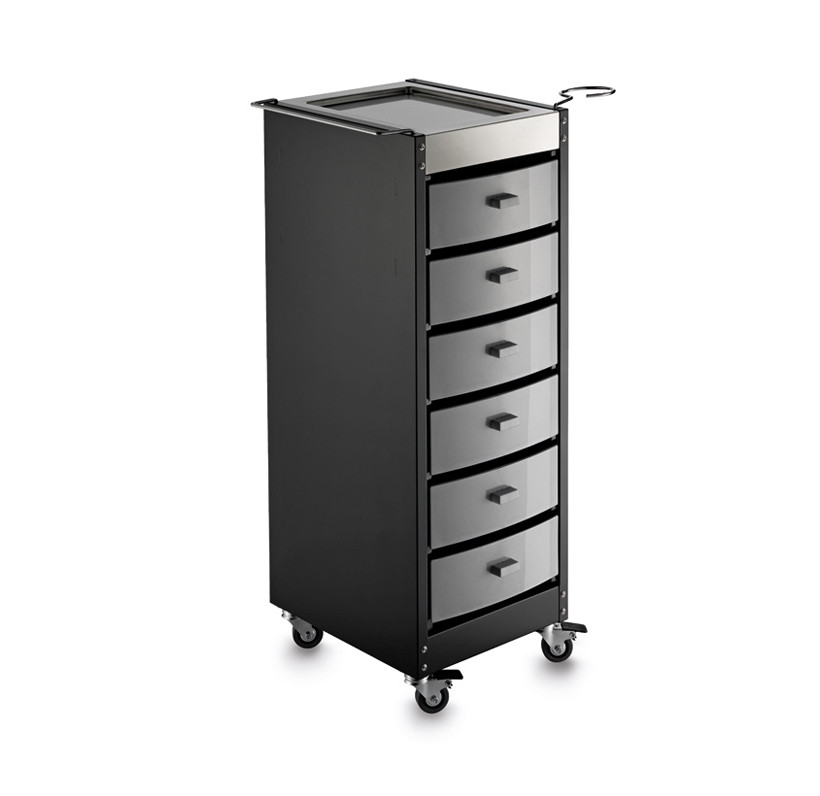 Тележка парикмахерская закрытого типа с шестью выдвижными пластиковыми ящиками. Выполнена из металла, окрашенного в черный матовый цвет, столешница из стали, для удобства работы с горячими инструментами. Тележка на колесиках со стопорами, имеет металлический фенодержатель.