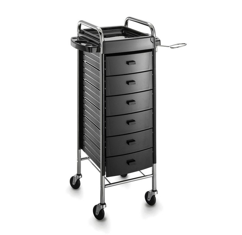Тележка парикмахерская закрытого типа на хромированном каркасе из прочного пластика с шестью выдвижными ящиками. Оснащена прорезиненными колесами для комфортного и бесшумного перемещения, металлическим фенодержателем и боковыми полками с отделениями для сопутствующих аксессуаров.