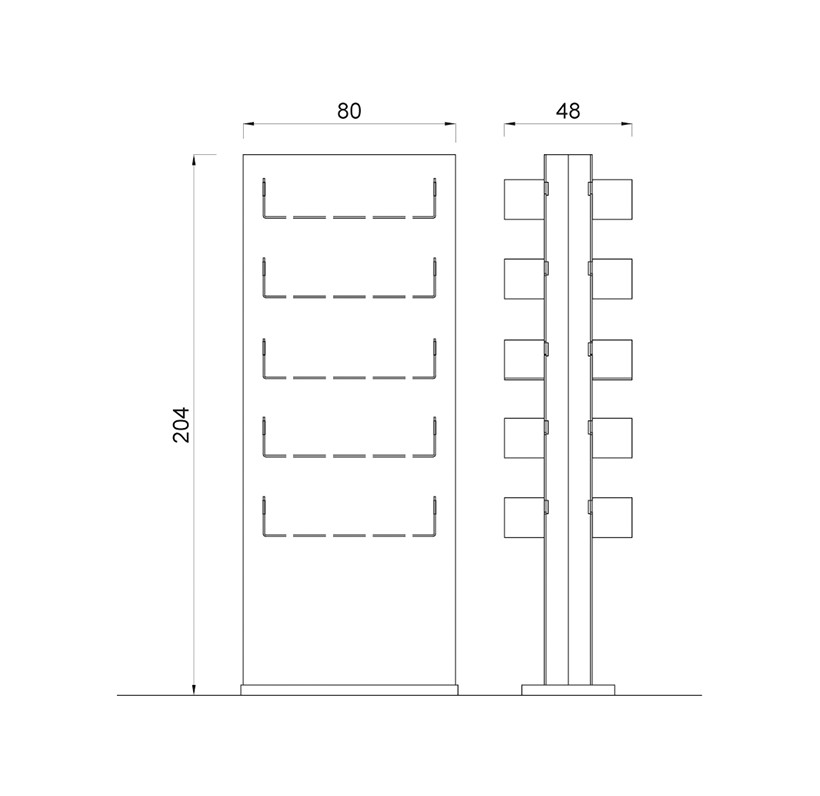 Двухсторонняя витрина с пятью полками с каждой стороны. Каркас витрины выполнен из акрила белого цвета. Витрина оснащена подсветкой. Крепление к полу.