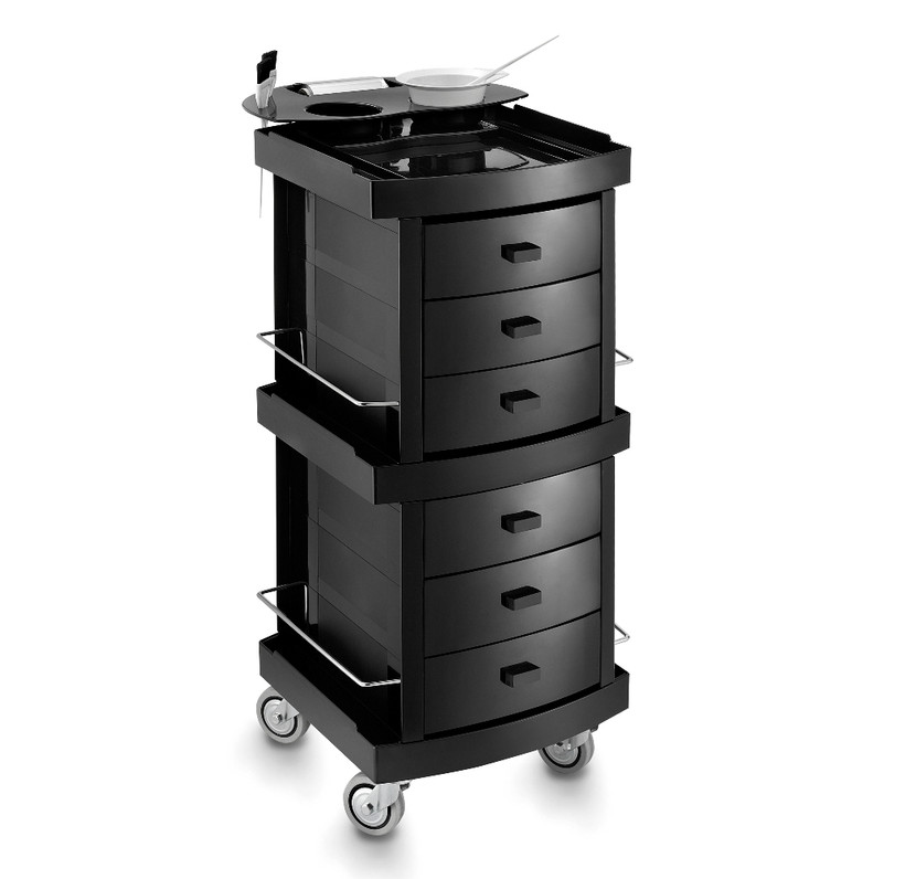 Тележка парикмахерская из прочного пластика закрытого типа на колесах с шестью выдвижными ящиками. Имеет съёмный портативный лоток с двумя отделениями под миски для окрашивания, двумя отверстиями под кисти и держателем для фольги. Также тележка оснащена боковыми ограждениями и отделениями под сопутствующие аксессуары.