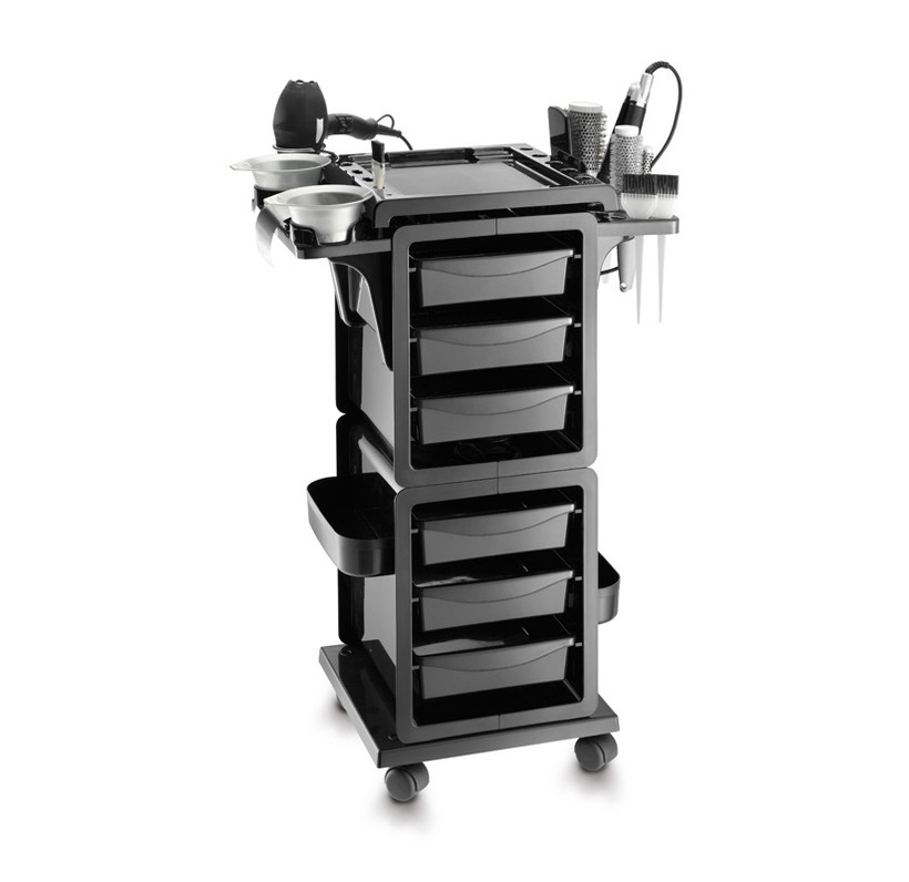 Тележка парикмахерская из прочного пластика на колесах. Оснащена боковыми лотками, которые регулируются по высоте. Также тележка имеет боковые лотки с двумя отделениями под миски для окрашивания, отделение с держателем для фольги, металлический фенодержатель и отделения под кисти и сопутствующие аксессуары.