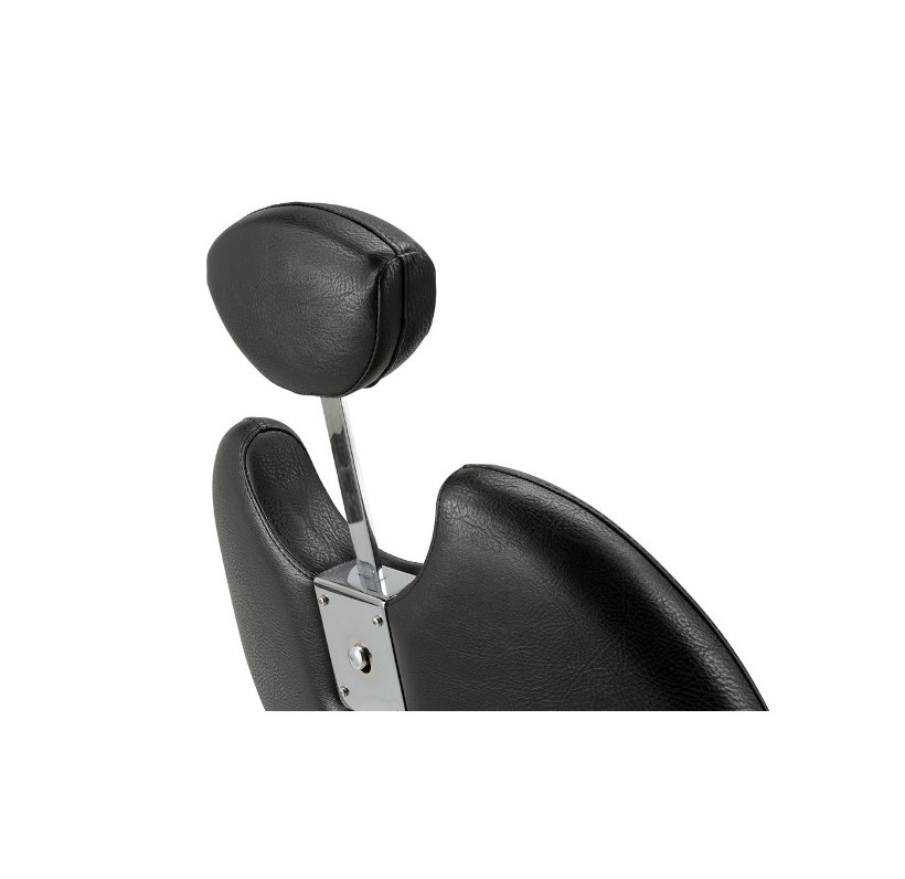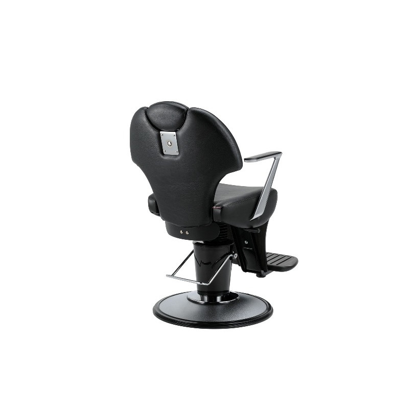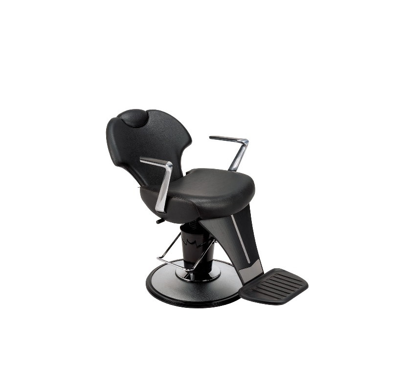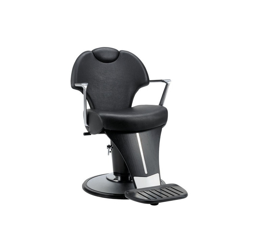 Кресло для клиента – мужское, на гидравлике с блокировкой на диске. Каркас кресла изготовлен из многослойной фанеры, выполнен из высококачественного полиуретана. Кресло оснащено алюминиевыми хромированными подлокотниками, регулируемой спинкой и деревянной подставкой для ног, окрашенной в черный цвет, накладки на пороги из полированной нержавеющей стали, также кресло имеет регулируемый по высоте подголовник. Обивка - искусственная кожа высшего качества.