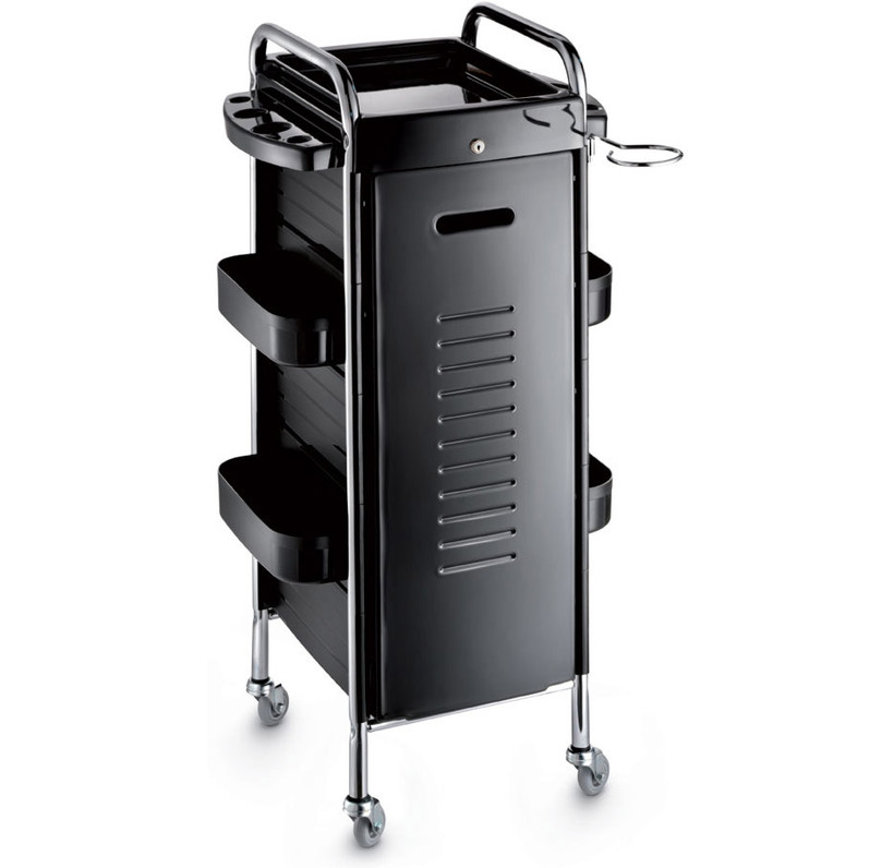 Тележка парикмахерская закрытого типа на хромированном каркасе из прочного пластика с пятью выдвижными ящиками. Оснащена прорезиненными колесами для комфортного и бесшумного перемещения, металлическим фенодержателем, боковыми полками с отделениями для сопутствующих аксессуаров, а также четырьмя съёмными лотками, которые регулируются по высоте. Тележка закрывается противоскользящей панелью с ключом.
