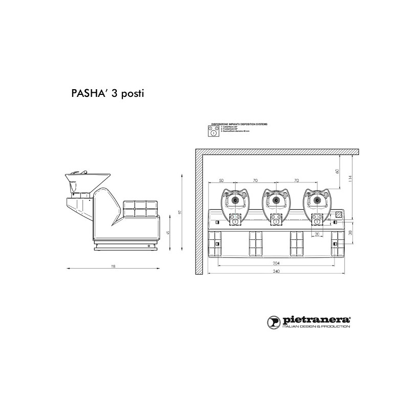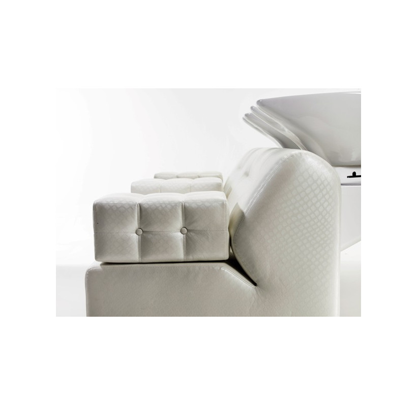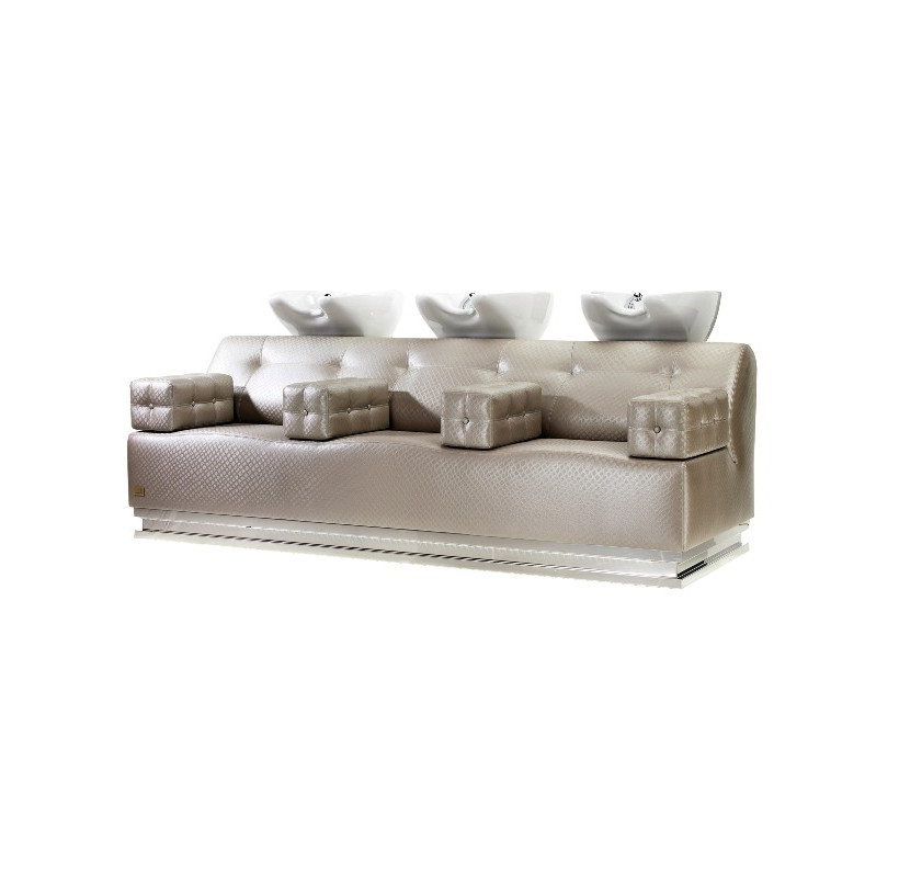 Мойка трехместная. Каркас мойки выполнен из высококачественного полиуретана. Кресло оснащено мягкими и комфортными подушками-подлокотниками. Обивка - искусственная кожа высшего качества. Мойка комплектуется глубокими керамическими раковинами с регулировкой угла наклона и комплектами смесителей с drip-proof shower "каплезащитным" душем.