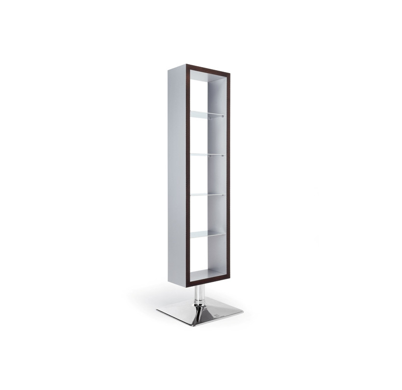 Напольная витрина с четырьмя полками. Витрина выполнена из дерева. Витрина оснащена полками из стекла и металлическим основанием квадратной формы.