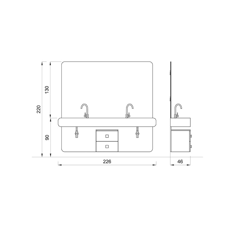 Мужское зеркало "1967 ECO 2" на 2 рабочих места. Рабочий туалет оснащен столешницей из искуственного камня (кориан), двумя интегрированными (в столешницу) раковинами с комплектом смесителя, тумбой для хранения инструментов.