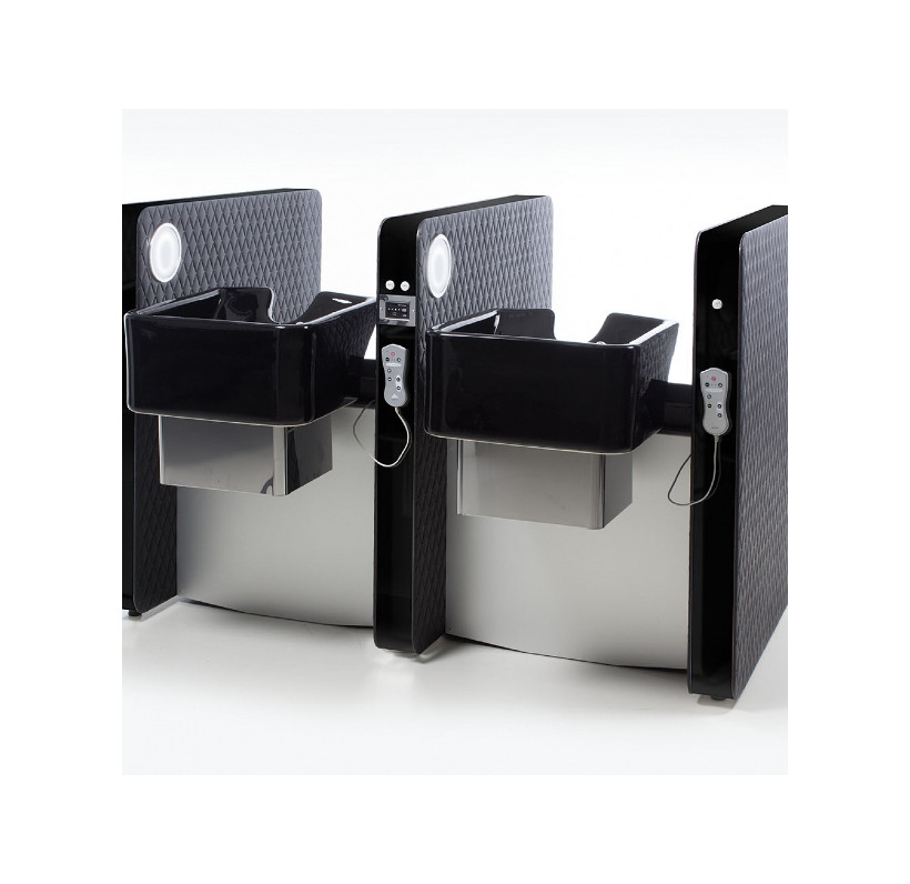 Мойка парикмахерская - трехместная с высоким уровнем комфорта и приватной зоной. Мойка оснащена мягкими и комфортными подлокотниками и системой воздушного массажа AIR-SHIATSU. Также мойка оснащена электрической регулировкой сидения, спинной части и опоры для ног. Движения синхронизированные, что позволяет клиенту принять положение "полулежа" обеспечивая максимальный комфорт. Мойка комплектуется глубокой керамической раковиной с регулировкой угла наклона и комплектом смесителя. Обивка - искусственная кожа высшего качества. Отделка боковин - исскуственная кожа коллекции "PRIVACY COLLECTION" или акрил. Окантовка боковин - сталь.