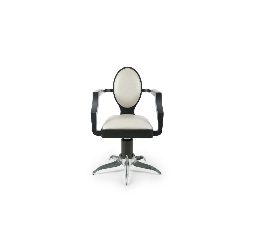 Дизайнерское парикмахерское кресло. Кресло для клиента комплектуется металлическим основанием. Кресло оснащено комфортными деревянными подлокотниками с накладками из исскуственной кожи. Каркас кресла выполнен из окрашенного дерева. Варианты цвета каркаса кресла на выбор: беленый дуб (FAGGIO SBIANCATO) или венге (FAGGIO TINTO EBANO). Обивка - искусственная кожа высшего качества.