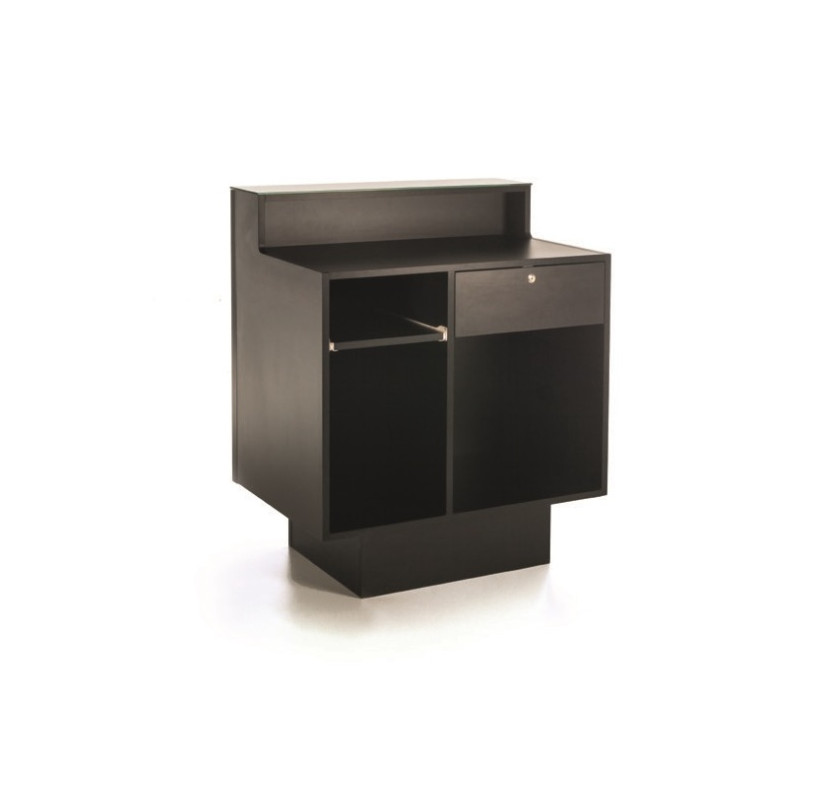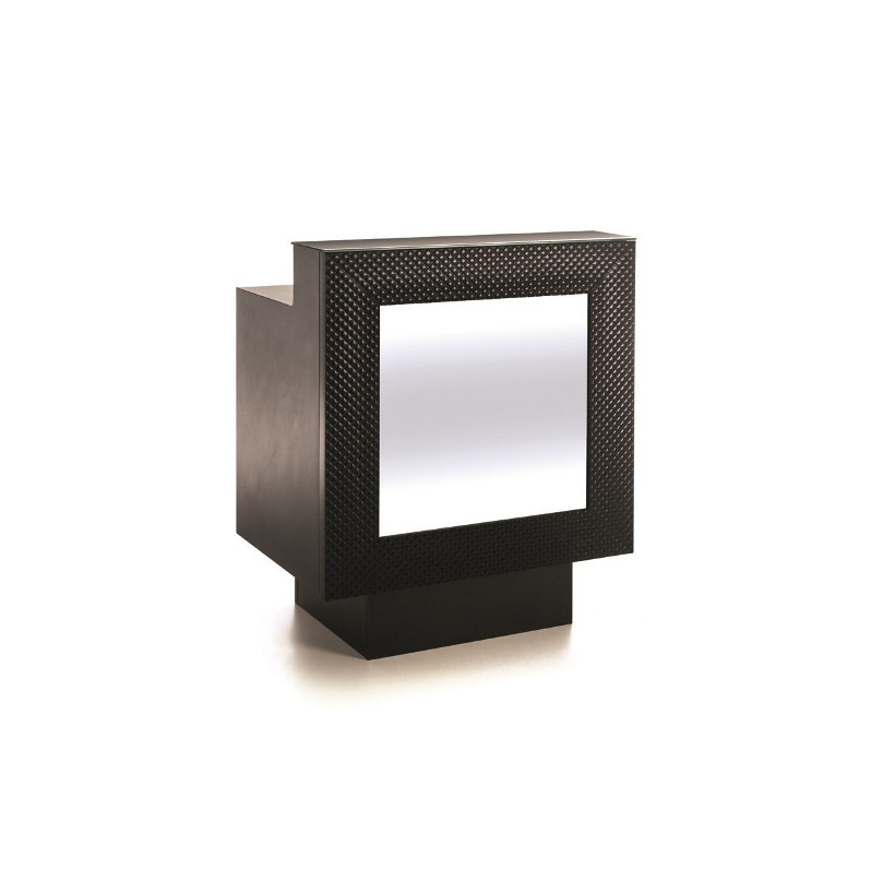 Стойка администратора. Корпус и наполнение выполнены в ламинате черного или белого цвета. Фасад выполнен в черной декоративной рамке со вставкой оргстекла. Стойка адмистратора оснащена фронтальной подсветкой, выдвижным ящиком и полками для хранения.