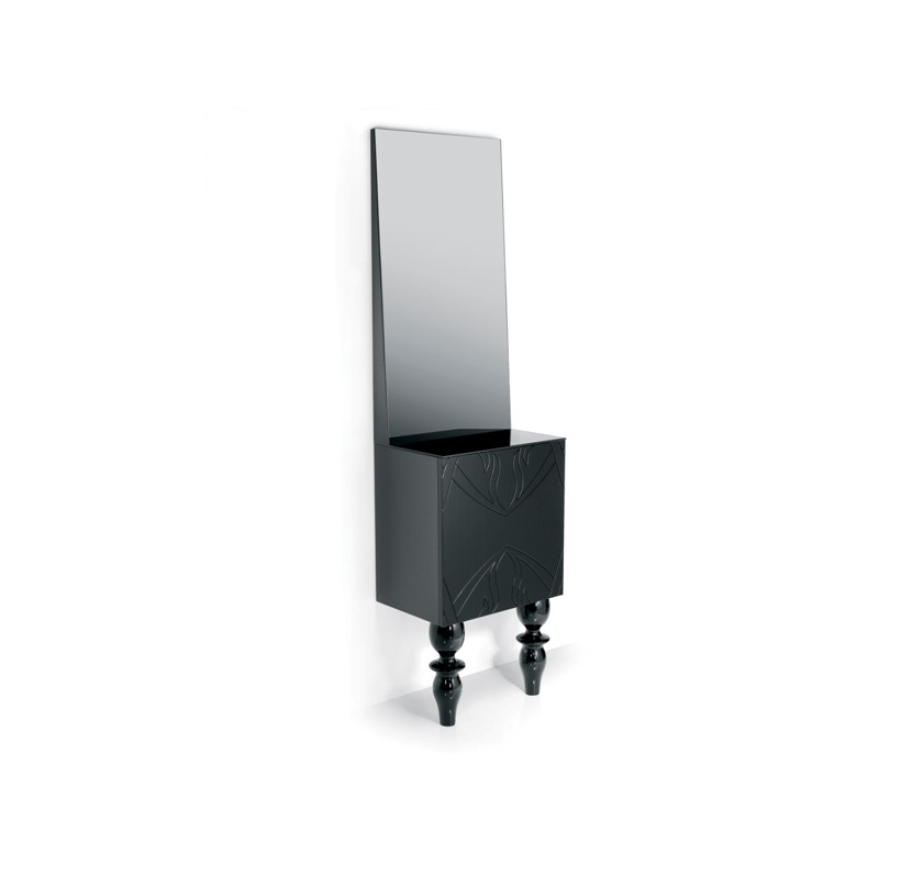 Корпус тумбы выполнен из глянцевого акрила черного или белого цвета с рисунком. Тумба оснащена резными ножками. Крепление к стене.