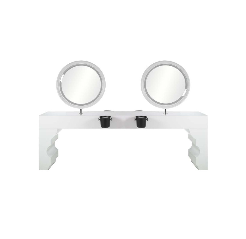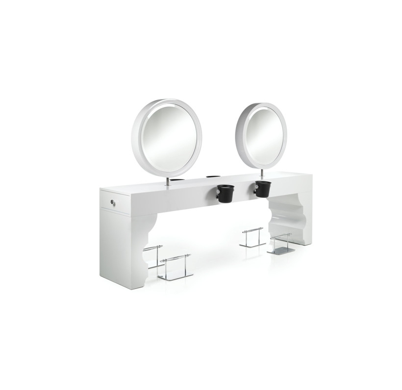 Двусторонний рабочий туалет на четыре рабочих места. Рабочий туалет выполнен в ламинате белого цвета. Рабочий туалет оснащен фенодержателями LIBIAM WALL. Подставки для ног не включены в стоимость.