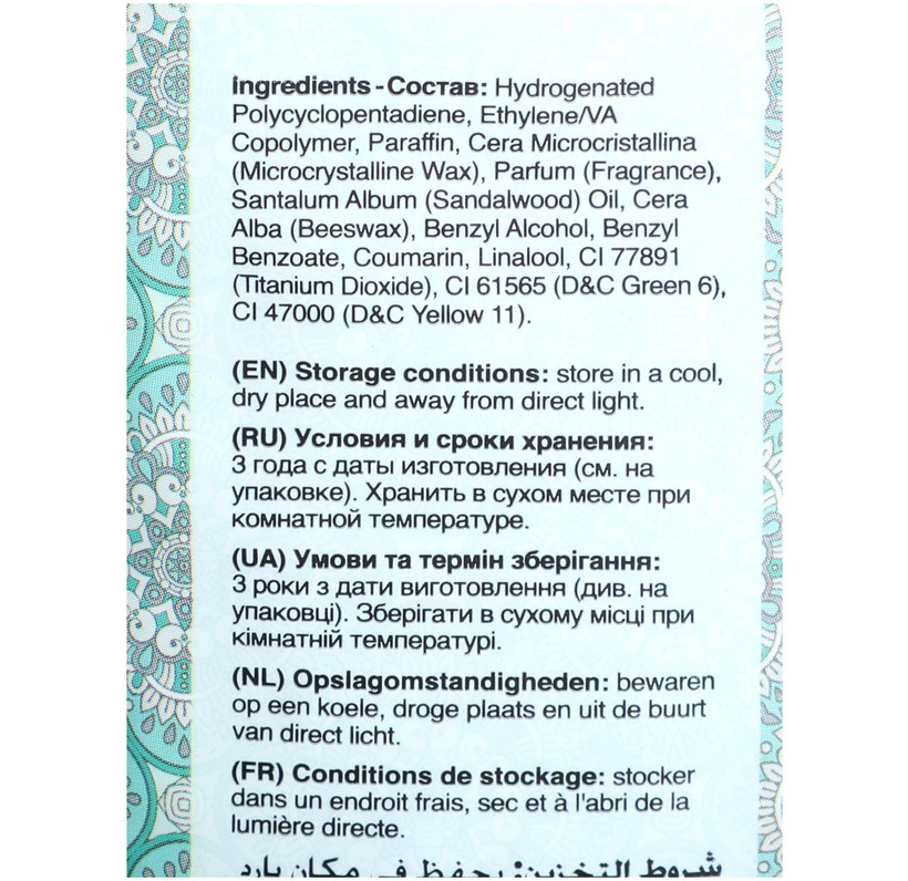 Hydrogenated Polycyclopentadiene, Ethylene/va Copolymer, Paraffin, Cera Microcristallina (Microcrystallina Wax), Cera Alba (Beeswax), Parfum (Fragrance), Benzul Alcohol, Benzul Benzoate, Coumarin, Linalool, CI 61565, CI 47000, CI 77891.