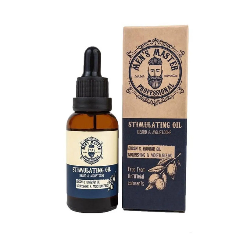 MEN`S MASTER Масло стимулирующее для бороды и усов, 30 мл. Стимулирующее масло для бороды и усов Men's Master богато маслами баобаба, арганы, жожоба, миндаля и касторового масла, которые помогают отрастить бороду и придать ей блеск. Увлажняет и питает бороду и кожу под ней. Это масло для бороды не содержит таких загрязнений, как красители.