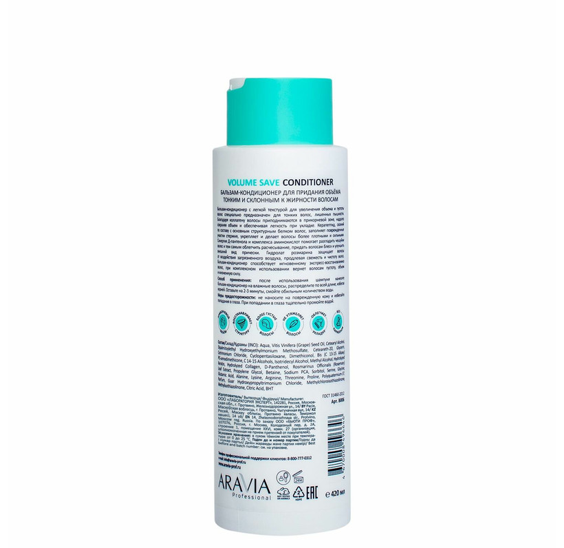 ARAVIA Volume Save Conditioner выпускается в мультиколорном дизайне объемом 420 мл. Страна бренда - Россия.