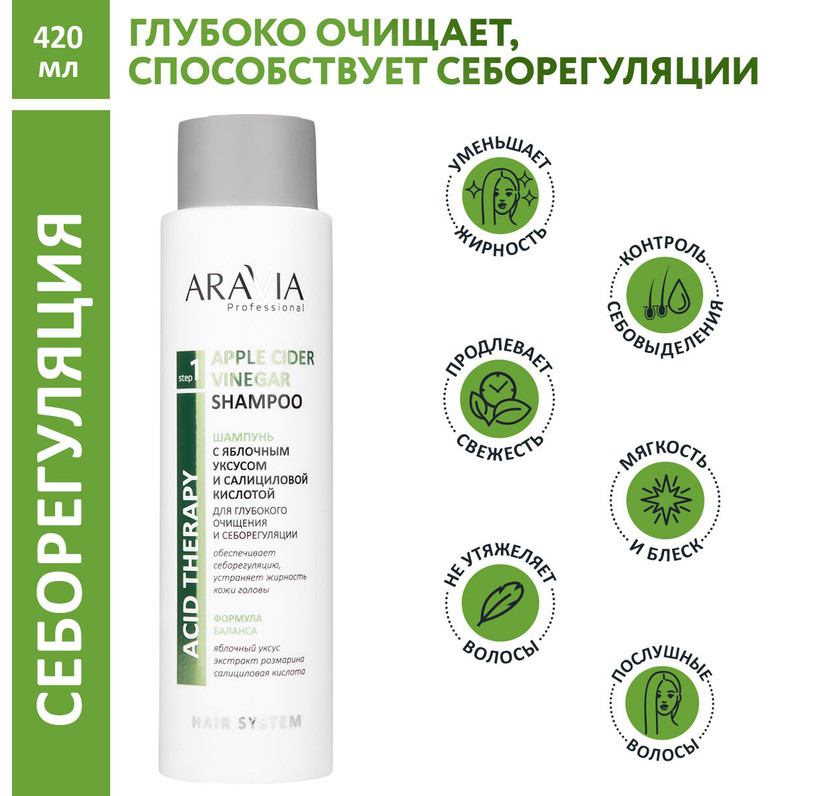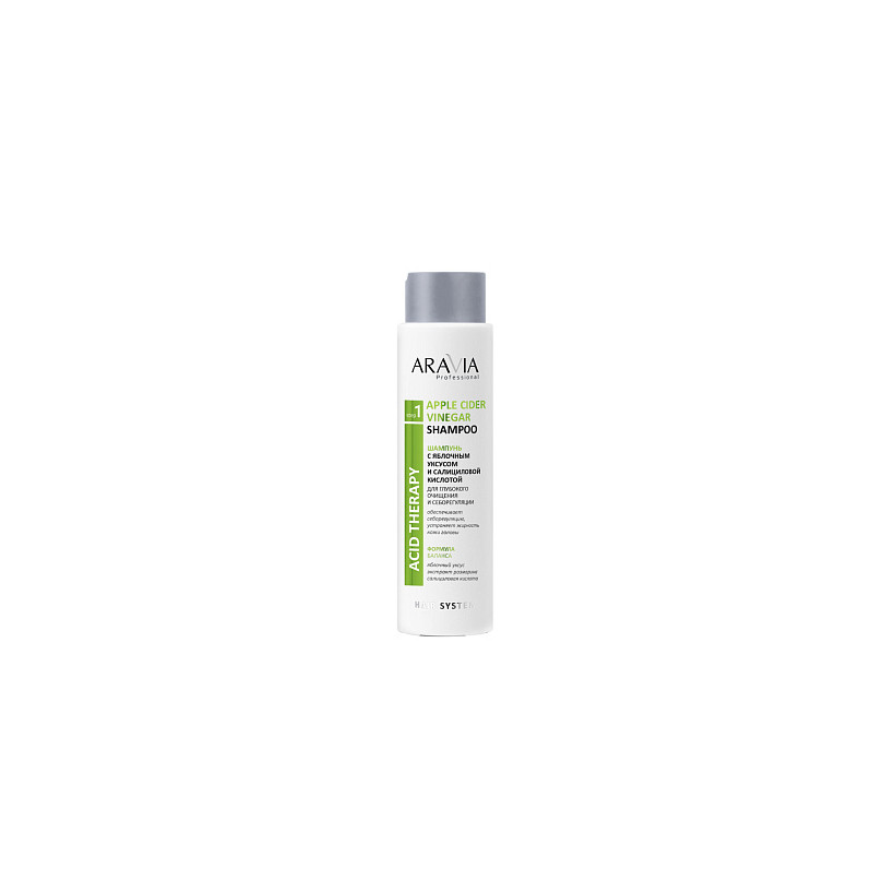 Шампунь ARAVIA Professional с яблочным уксусом и салициловой кислотой - эффективное средство для ухода за волосами и кожей головы. Объем составляет 420 мл, что делает его экономичным и удобным в использовании.