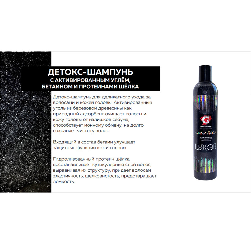 Детокс-шампунь с активированным углем, бетаином и протеинами шелка LUXOR PROFESSIONAL 340 мл.