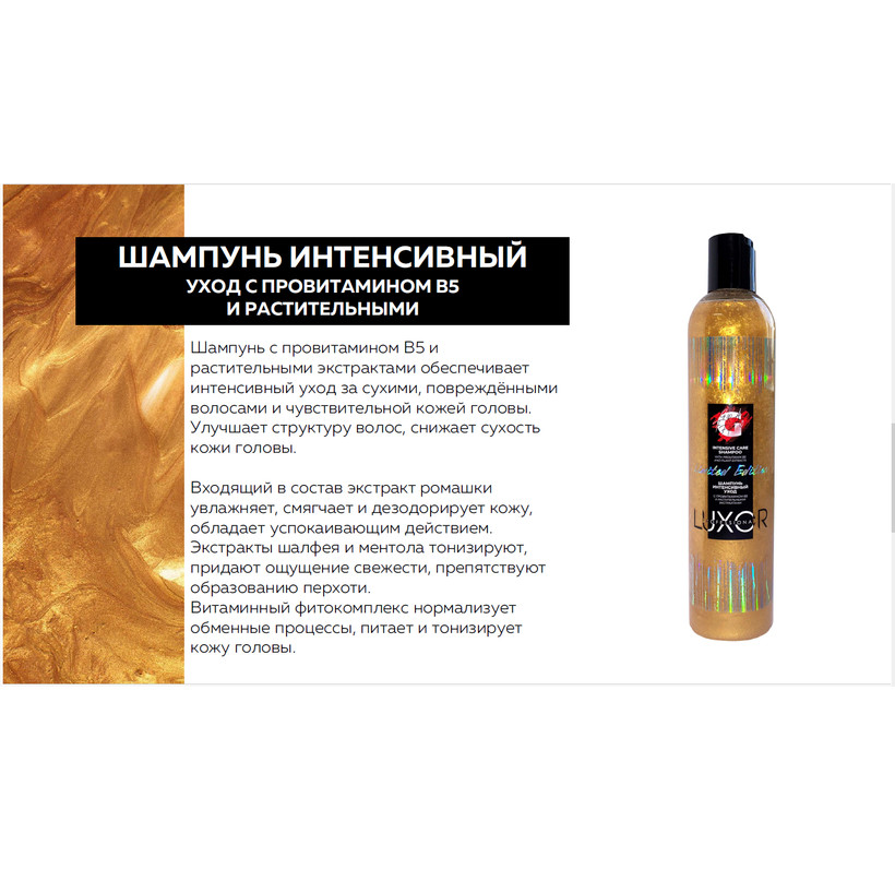 Интенсивный уход за волосами и кожей головы: Шампунь LUXOR PROFESSIONAL с провитамином В5 и растительными экстрактами обеспечивает интенсивный уход за сухими, поврежденными волосами и чувствительной кожей головы. Улучшает структуру волос, снижает сухость кожи головы и увлажняет, смягчает, дезодорирует кожу, обладает успокаивающим действием.