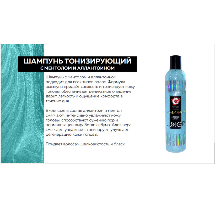 Придаёт волосам шелковистость и блеск: шампунь тонизирующий с ментолом и аллантоином LUXOR PROFESSIONAL обеспечивает уход за волосами, делая их более здоровыми и красивыми.