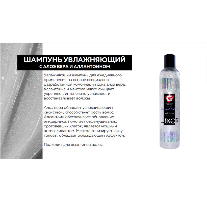 Увлажняющий шампунь LUXOR PROFESSIONAL на основе специально разработанной комбинации сока алоэ вера, аллантоина и ментола мягко очищает, укрепляет, интенсивно увлажняет и восстанавливает волосы.