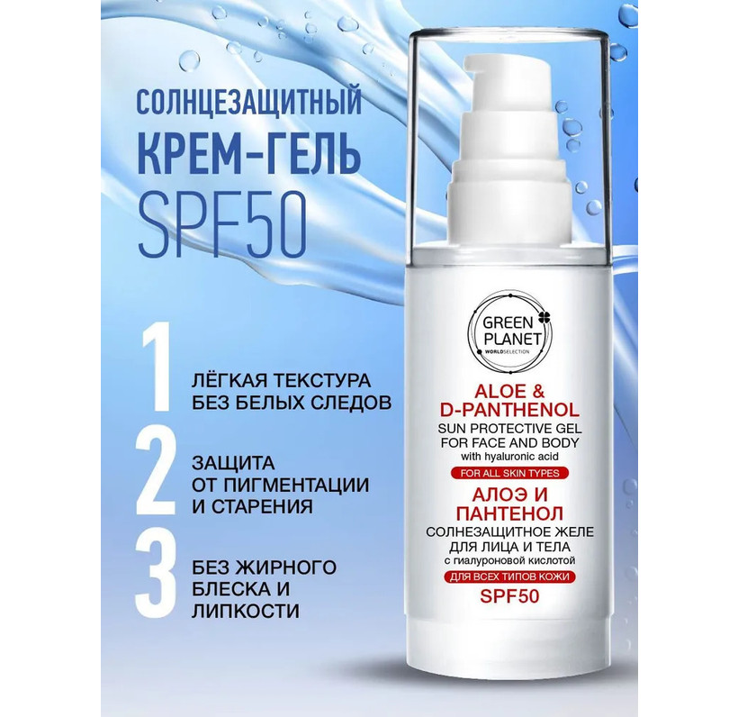 Крем для лица увлажняющий с спф 50 с гиалуроновой кислотой, алоэ и пантенолом имеет легкую тающую текстуру. Это полноценное уходовое средство содержит современные солнцезащитные фильтры, идеален для ежедневного ухода в городе круглый год, защитит от солнца в отпуске, в солярии перед загаром, от образования пигментных пятен, веснушек и обезвоженной кожи лица. Обязательно применяйте спф крем после пилингов, косметических процедур, а также если используете косметику с кислотами. Можно наносить на зону вокруг глаз, избегайте попадания на слизистую. Используйте в качестве дневного крема spf для лица, основы базы под макияж летом и зимой каждый день. Спф для лица имеет ламеллярную структуру, моментально впитывается, дает матовый финиш без жирного блеска и белых следов, обладает омолаживающим эффектом лифтинга, предупреждает старение, защищает от пигментации и веснушек, успокаивает, увлажняет, разглаживает мелкие морщины. Санскрин подходит всех типов мужской и женской кожи: жирной, смешанной, комбинированной, проблемной подростковой, с акне, зрелой взрослой, сухой, для шеи и зоны декольте. Некомедогенно. Ламеллярный солнцезащитный крем mle идеален после татуажа. Современный комплекс UVA/UVB фильтров широкого спектра защищает кожу от негативного воздействия УФ-излучения фотостарения и пигментации, сохраняет влагу, антивозрастной уход. Растительные компоненты и пантенол успокаивают и разглаживают. Производится по рекомендациям европейских производителей солнцезащитных фильтров. Эффективная и надежная защита от солнца. Косметическая линия GREEN PLANET имеет удобный дозатор. При первом использовании необходимо осуществить многократное нажатие.