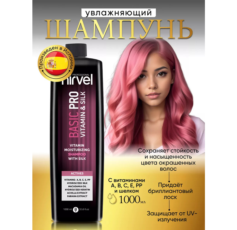Витаминный увлажняющий шампунь с шелком Nirvel Basic Pro Vitamin Moisturizing Shampoo бережно очищает, активно увлажняет и регенерирует волосы, сохраняет стойкость и насыщенность цвета окрашенных волос длительное время.