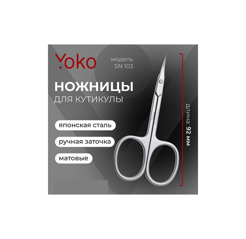 Yoko { Йоко } SN 103 Ножницы для кутикулы - Маникюрные ножницы Yoko выполнены из легированной японской стали высокой прочности 53 HRC. Обработка и заточка лезвий производится вручную профессиональными мастерами. Особое внимание при изготовлении инструмента уделяется форме полотен, конструкции сустава и настройке хода, так как именно от этих параметров зависит безупречная работа инструмента. Все ножницы проходят обязательные процедуры контроля качества в соответствии со стандартами ISO 9001.