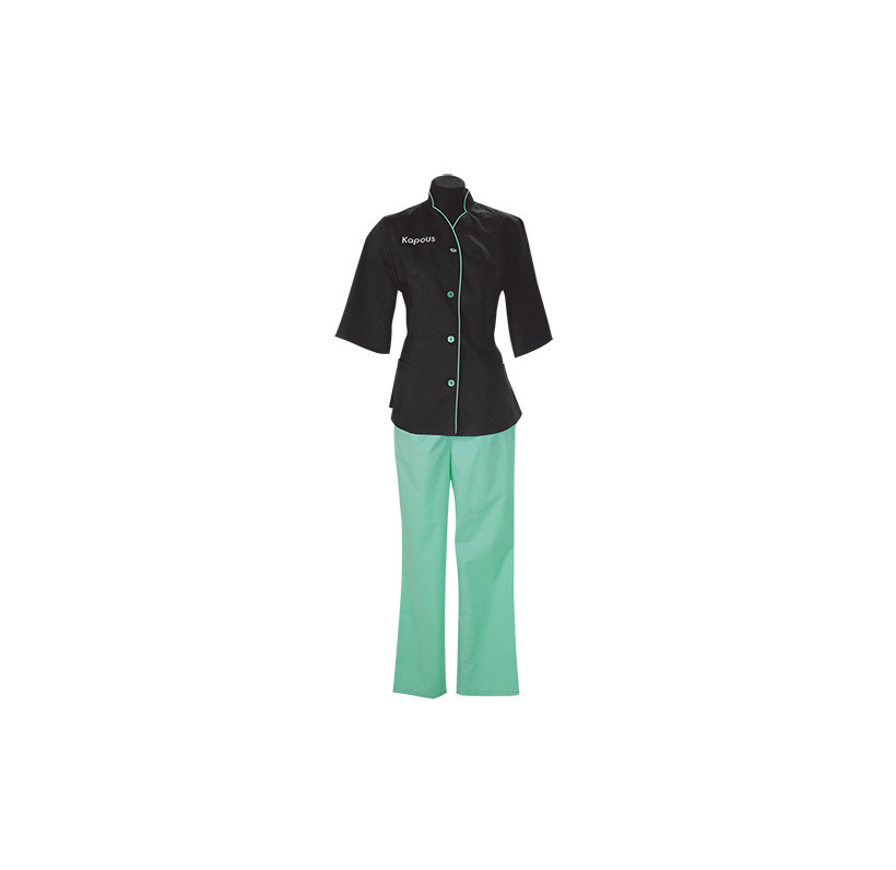 Черного цвета с декоративной окантовкой свежего мятного оттенка. На груди декоративная вышивка белыми нитями «Kapous» шириной 9 см. Накладные карманы для удобства мастера. Рукава комфортной длины 3/4. Завязки на спине позволяют идеально посадить блузу на любой тип фигуры, выгодно подчеркнуть талию.