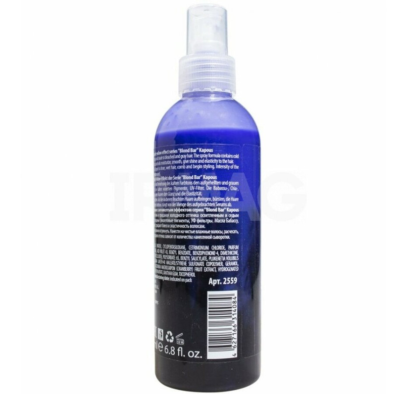 Сыворотка содержит холодные фиолетовые пигменты, которые эффективно нейтрализуют желтизну и придают волосам холодный оттенок. УФ-фильтры в составе продукта обеспечивают защиту волос от воздействия солнечных лучей.