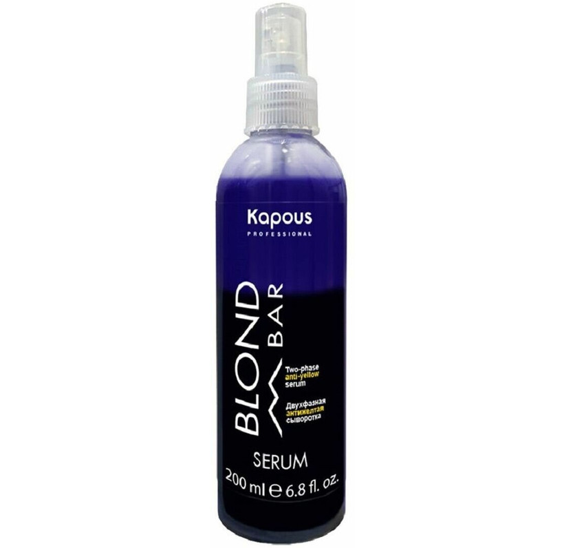 Двухфазная сыворотка для волос Kapous "Blond Bar" с антижелтым эффектом - это профессиональное средство для ухода за осветленными и седыми волосами, которое обеспечивает увлажнение, разглаживание, придание блеска и эластичности. Оно подходит для всех типов волос и не требует смывания.