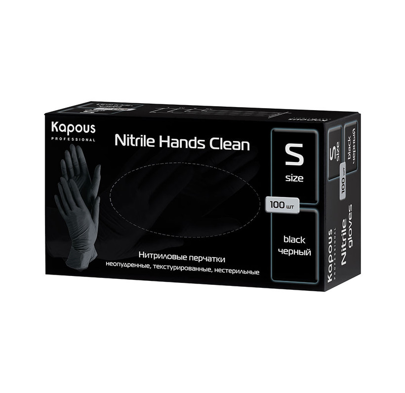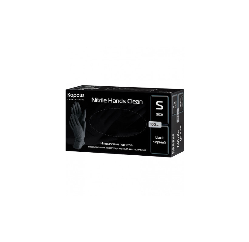 Нитриловые перчатки неопудренные, текстурированные, нестерильные "Nitrile Hands Clean" Kapous, черные, 100 шт., S