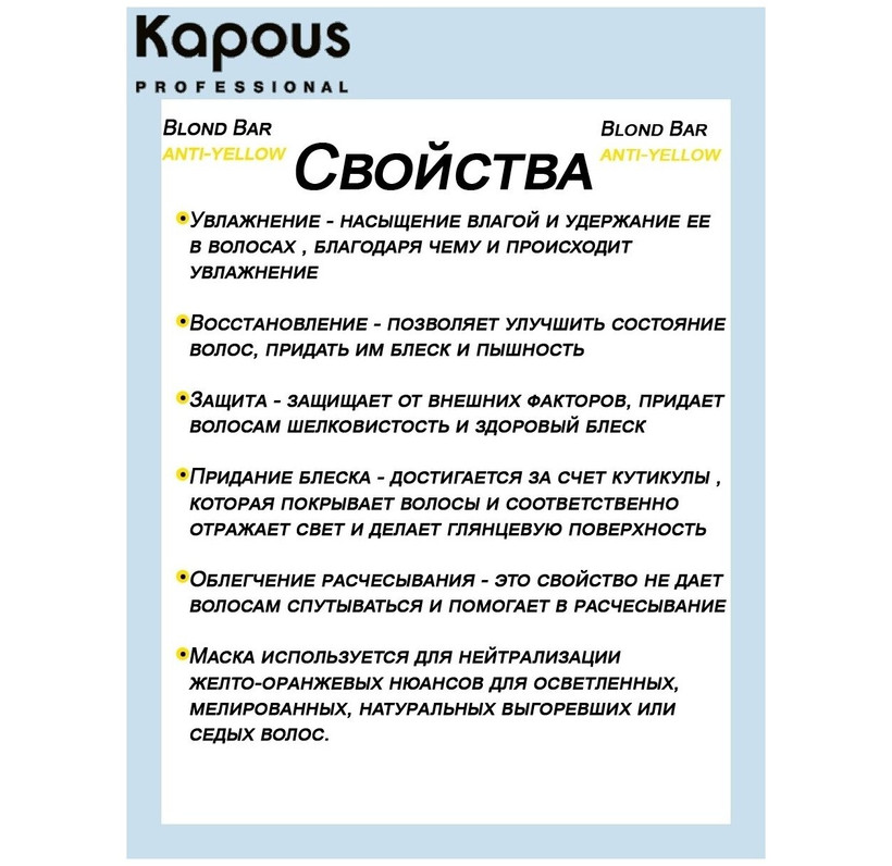 Маска Kapous "Blond Bar" также содержит пантенол, который обеспечивает защиту цвета и придает волосам блеск.