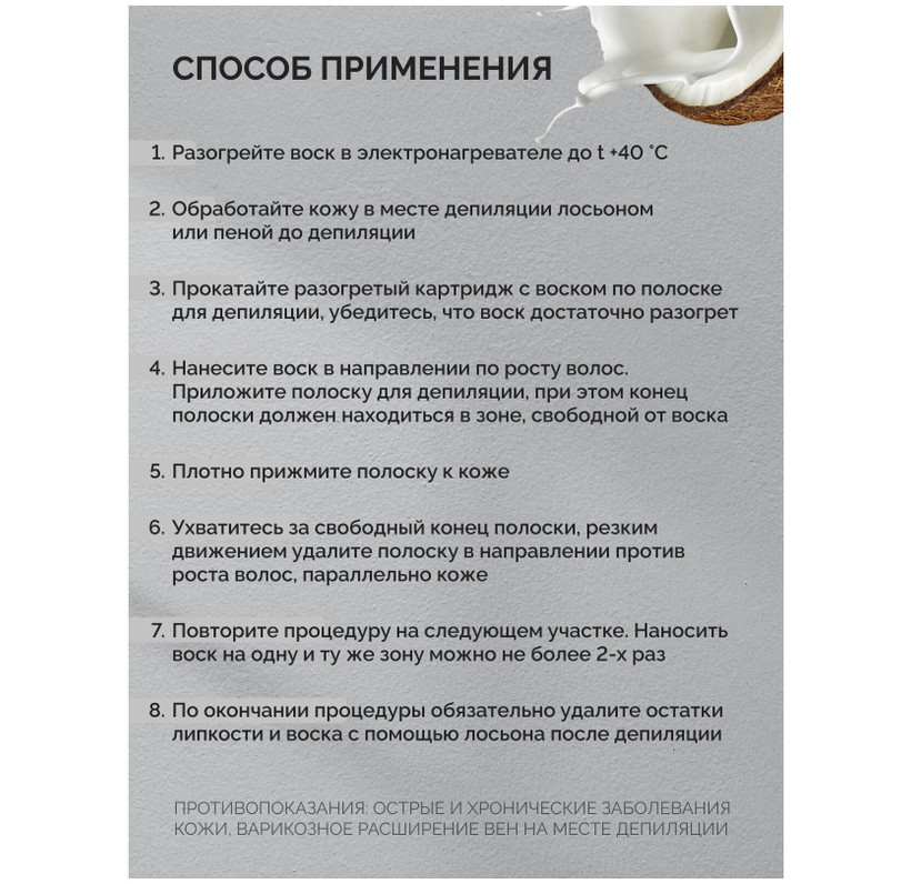 В составе воска присутствуют масло кокоса и диоксид титана, которые обеспечивают эффективное удаление волос и ухаживают за кожей. Масло кокоса питает и увлажняет кожу, а диоксид титана способствует улучшению кровообращения и стимулирует рост новых волос.
