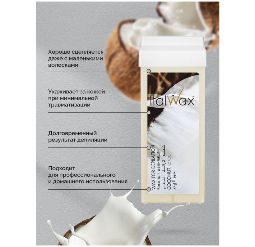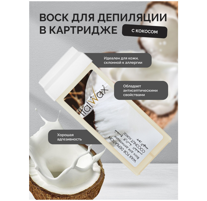Воск ITALWAX в картридже "Кокос плотный" подходит для домашнего и салонного использования. Он протестирован дерматологически и подходит для всех типов кожи.